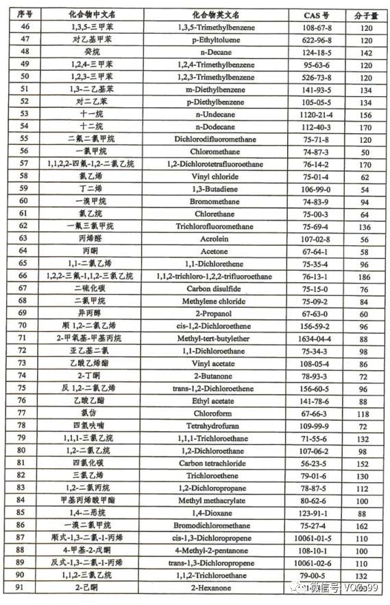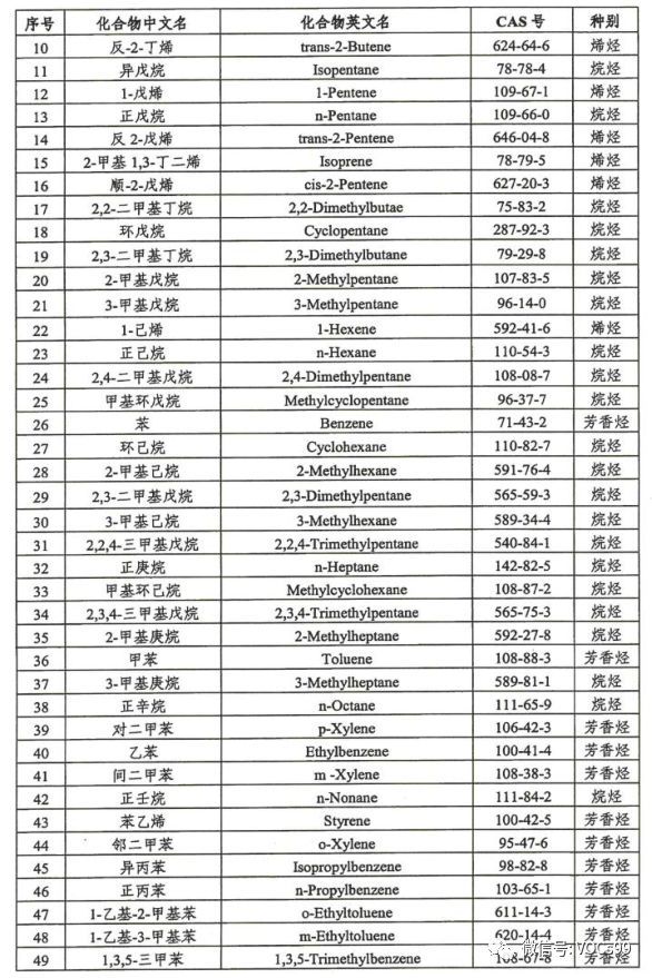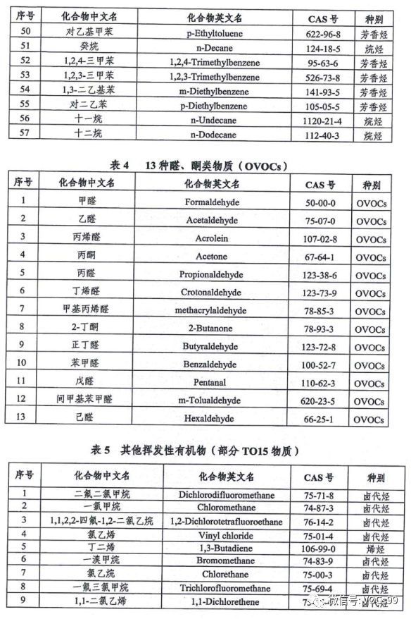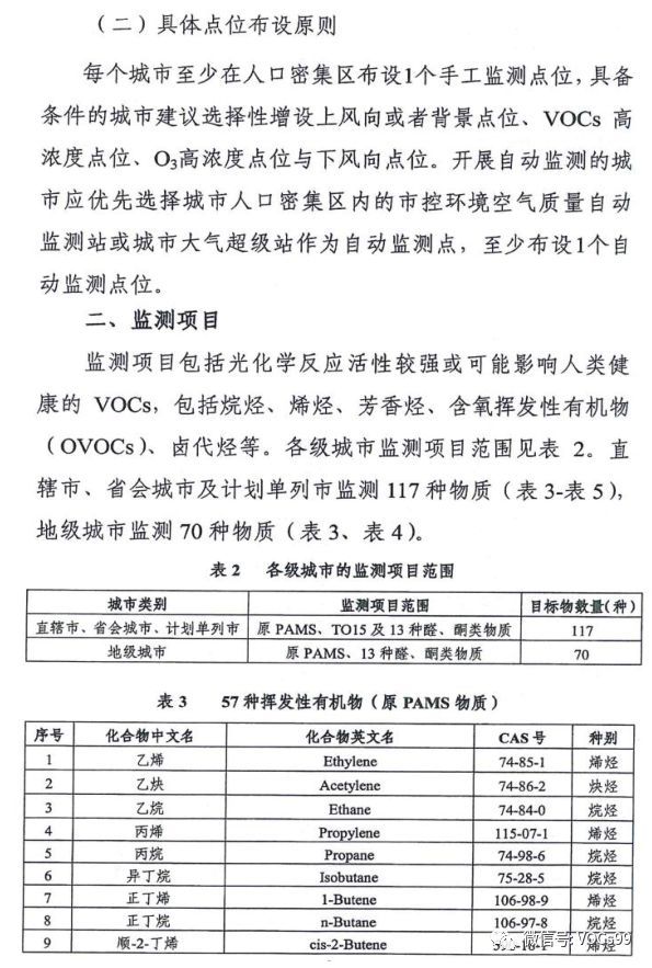 監(jiān)測(cè)項(xiàng)目包括光化學(xué)反應(yīng)活性較強(qiáng)或可能影響人類(lèi)健康的VOCs,包括烷烴、烯烴、芳香烴、含氧揮發(fā)性有機(jī)物(OVOCS)、鹵代烴等。各級(jí)城市監(jiān)測(cè)項(xiàng)目范圍見(jiàn)表2。直轄市、省會(huì)城市及計(jì)劃單列市監(jiān)測(cè)117種物質(zhì)(表3-表5),地級(jí)城市監(jiān)測(cè)70種物質(zhì)(表3、表4)。